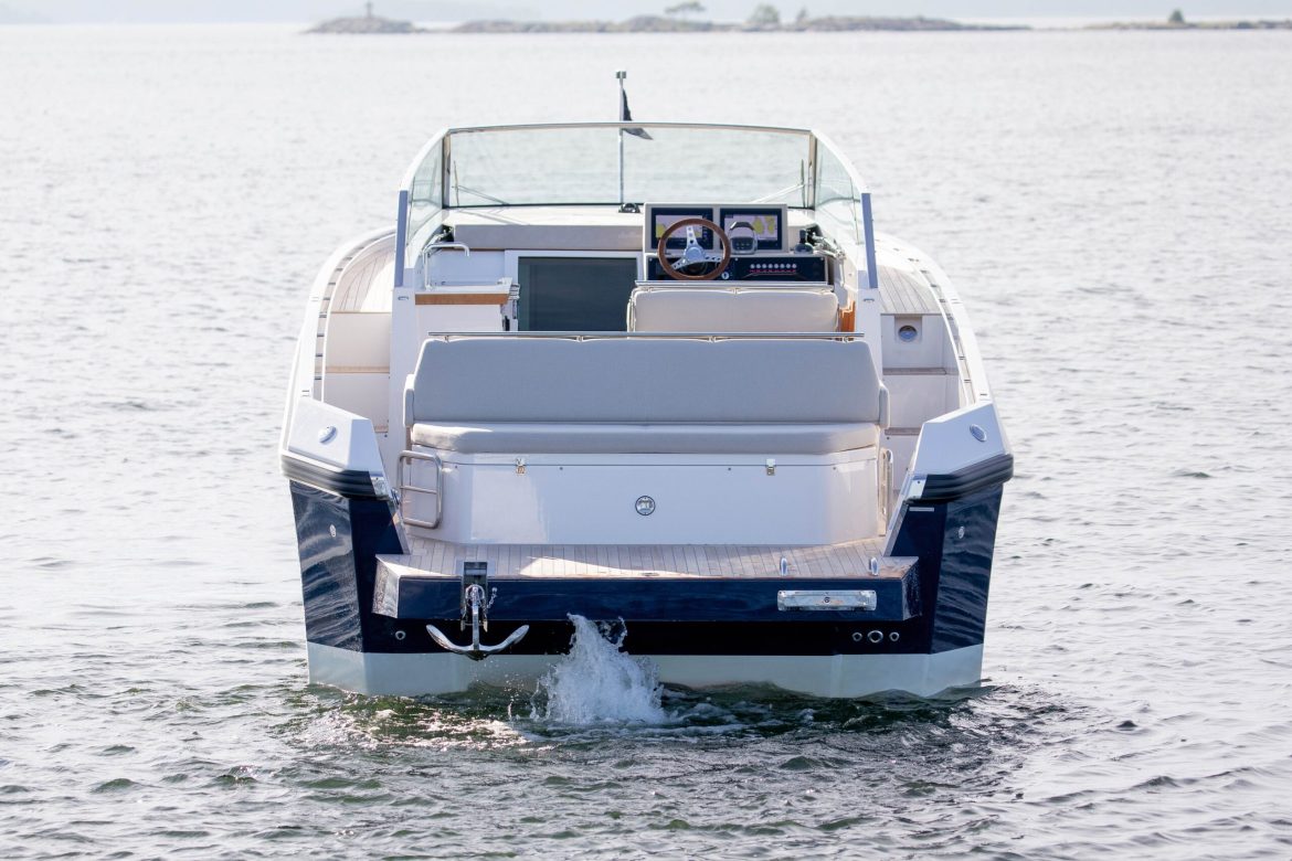 Turvaline ja ebatavaliselt ruumisäästlik tekilahendus hõlmab täielikult varustatud kambüüsi ning reguleeritavat ahtriala lounge’i, mida saab hõlpsalt muuta kas avaraks päevitusalaks või mugavaks einestamisnurgaks. Täielikult avatud ahter tagab sujuva ja takistusteta liikumise pikendatud ujumisplatvormile, mis on varustatud ujumisredeli ja mageveedušiga.